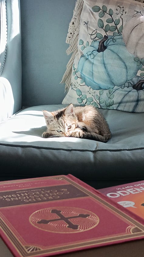 Thank you, once again, dear daughter, for your fantastic and fun and full thoughts of love for us all. I am thankful for our Savior's kindness to a needy and undeserving sinner like me. I am thankful for His unfailing and unchangeable love in Christ by His Spirit for His people. I'm thankful that "He who knew no sin became sin for us, so that in Him we might possess His perfect righteousness" (2 Cor. 5:21). I am thankful for Mama, you, and Esther, our church family, and our many friends. "Great is the LORD and greatly to be praised! ...Give thanks to the LORD for He is good, His steadfast love endures forever!" (Psalm 136). Looking forward to more fun and fantastic memories during Advent and Christmastide. Oh, and I'm grateful for Sawyer, the wee, sweet, little kitten.